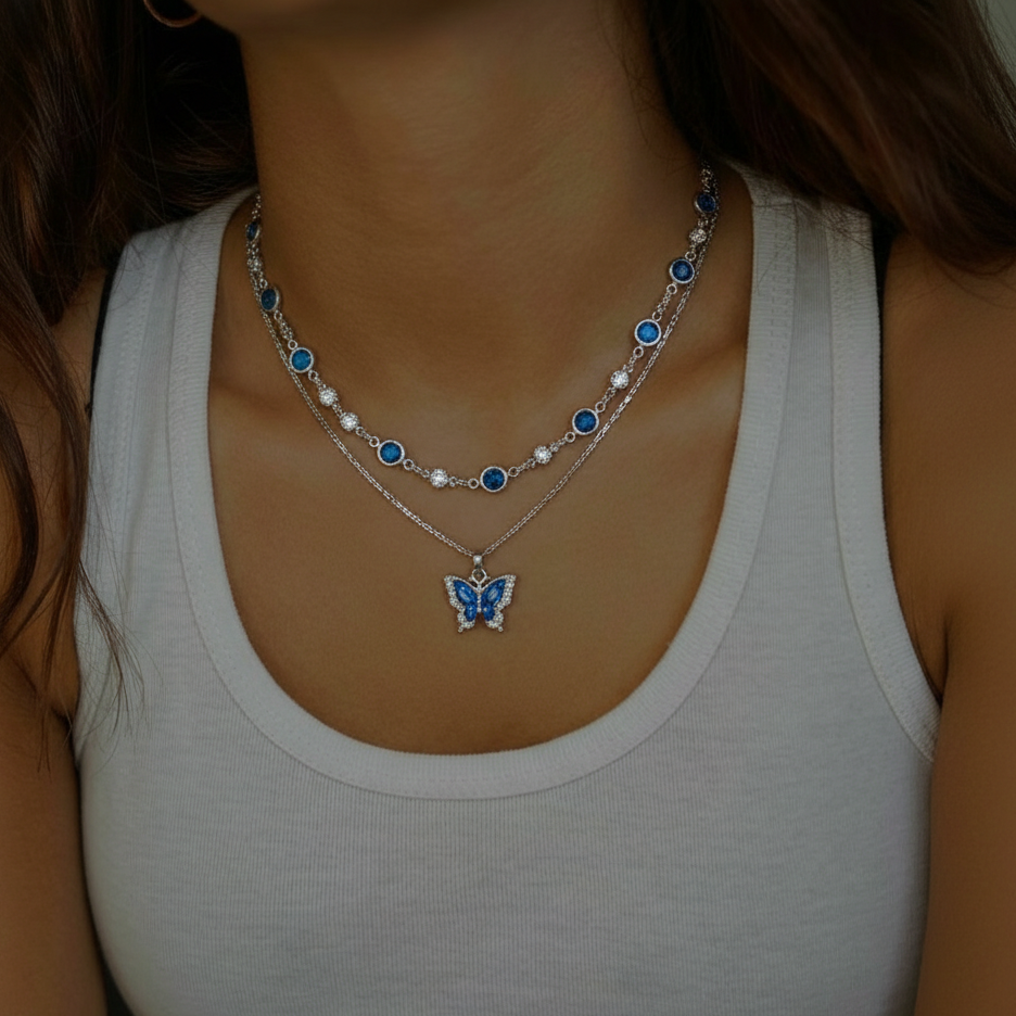 If "moody but magical" was a necklace, this would be it. ☁️🦋✨This two-in-one set features a halo of blue gems and the daintiest butterfly pendant. Perfect for brunch dates or just looking cute in your camera roll.